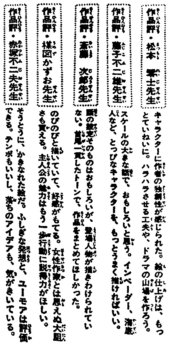 - そうとうに、かきなれた絵だ。ふしぎな発想と、ユーモアは評価できる。テンポもいいし、落ちのアイデアも、気がきいている。