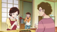 Just then, Shinobu and Ataru's Mother appear before them, noting they were concerned for him. Right as Ataru asked about why government officials surround him and lead him back home where Lum's Father sat by the living room table with his father. Lum's Father greets Ataru, who throws beans at him as a way to expel him from his house, and Lum's Father jovially takes the gesture. A trio of Oni soldiers then stops Ataru, and Lum's Father informs Ataru to take a seat as he's not going anywhere. It turns out that the Oni invaders have chosen Ataru to partake in a game that if he wins, the Oni invaders will leave the Earth, but if he loses, they'll conquer it. The game that the Oni had in mind was Tag. As Ataru processes this, an Oni warps down from the mothership and introduces herself as Lum. Lum's father then explains the rules of the game to Ataru, who is it and must grab Lum's horns within ten days, to which, Ataru proclaims in a lewd way he'll accomplish it. This prompts Shinobu a painful rebuke from Shinobu who storms out of his home. Accepting the challenge, Lum's Father happily announces that the game will start the next day.