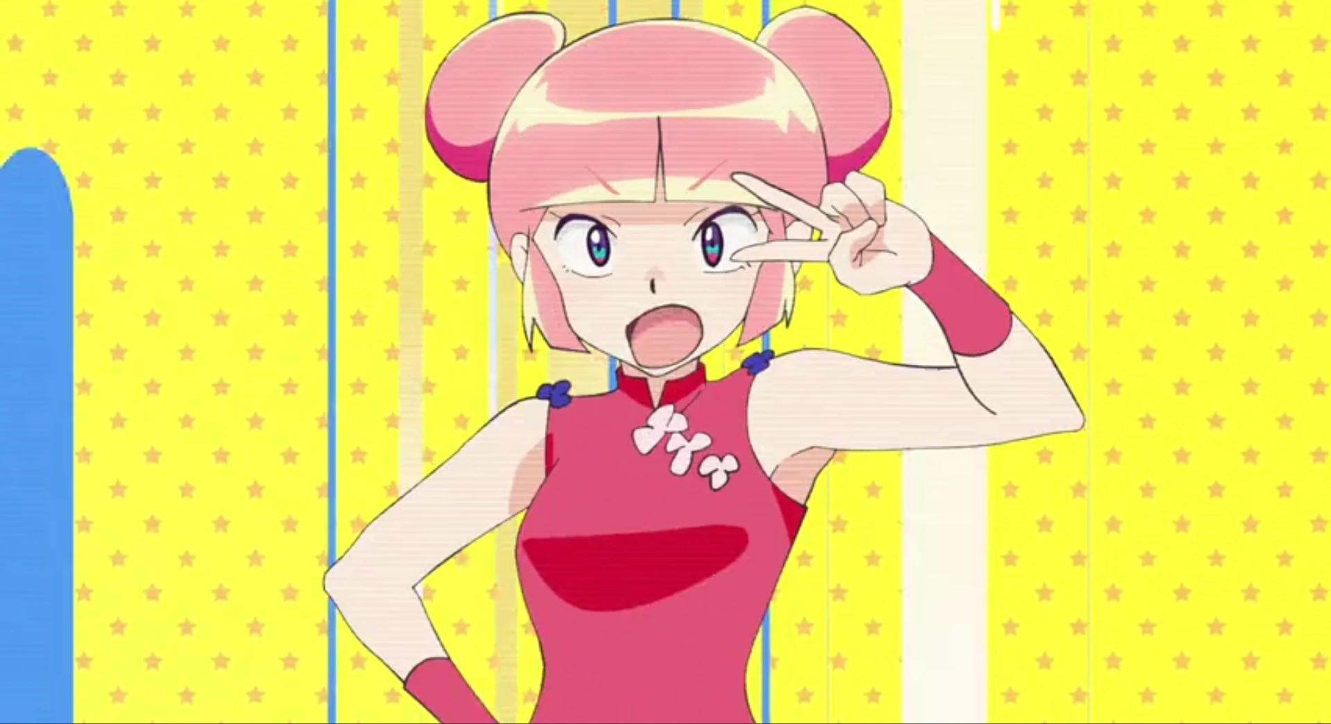 She wears a Chinese-style tunic and bun hairstyle (pink in the remake, black in the original).