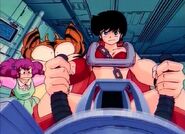 As Benten's bike can't carry everybody, she decides to comandeer the one spaceship on Earth which can; Ran's. Much to her shock and rage when Benten, Oyuki, Ataru and Mendo come storming into her place, climb into her cockpit, and launch her ship as she's in the middle of a date with Rei. As the g-force rattles his body, Ataru takes a moment to look at Lum's horns, clenched protectively tight in his hand, and vows that he'll save her.